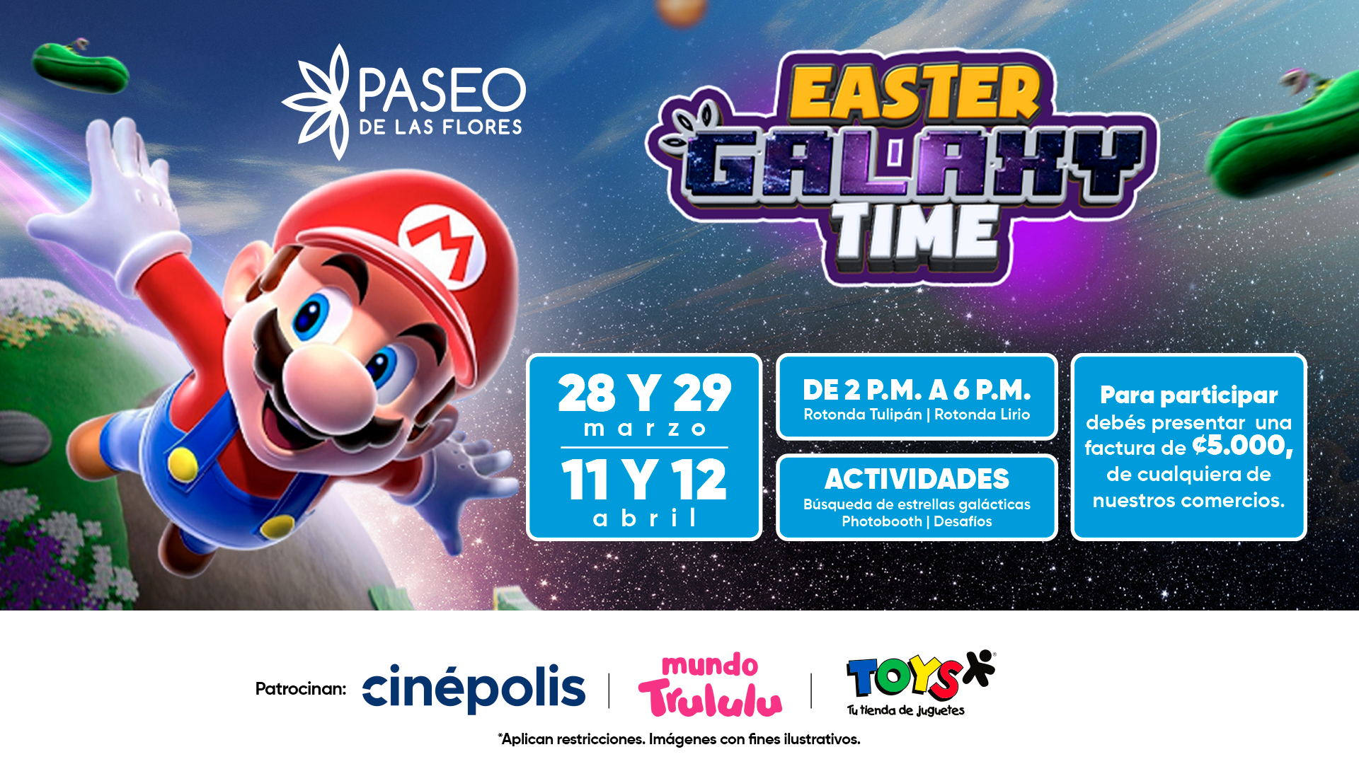 Las actividades se llevarán a cabo los fines de semana del 28 y 29 de marzo y 11 y 12 de abril del 2026. Para participar, se debe presentar una factura de consumo por un monto mínimo de ¢5,000 en cualquiera de nuestros comercios. Las facturas no son acumulables.